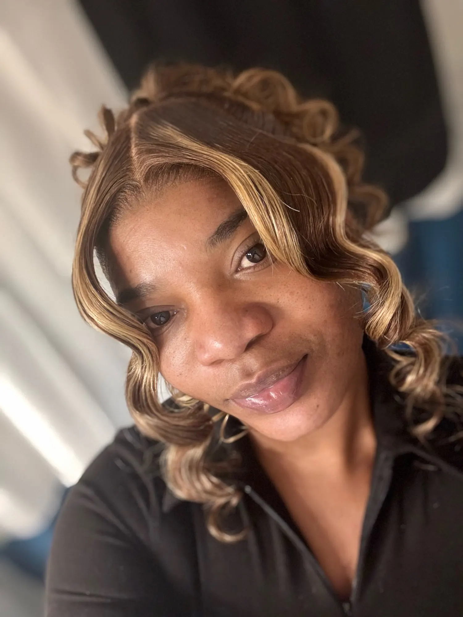Close-up and side angle views of highlight brown lace wig, featuring bouncy waves and realistic part.
