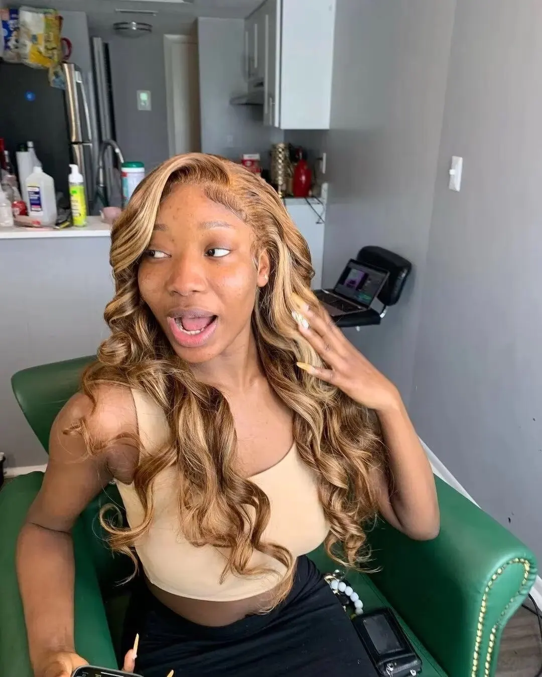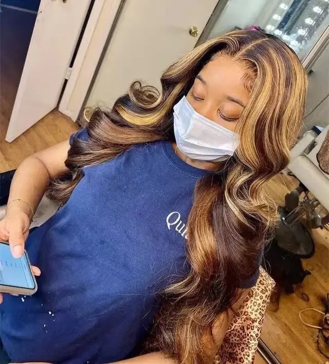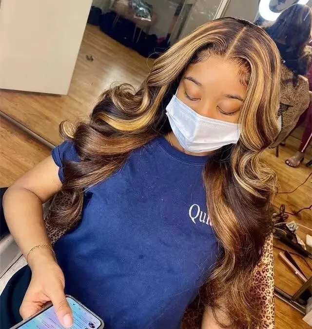 EuxmeHair highlight brown body wave wig shown with features: preplucked hairline, baby hair, lace melt, and parting space.