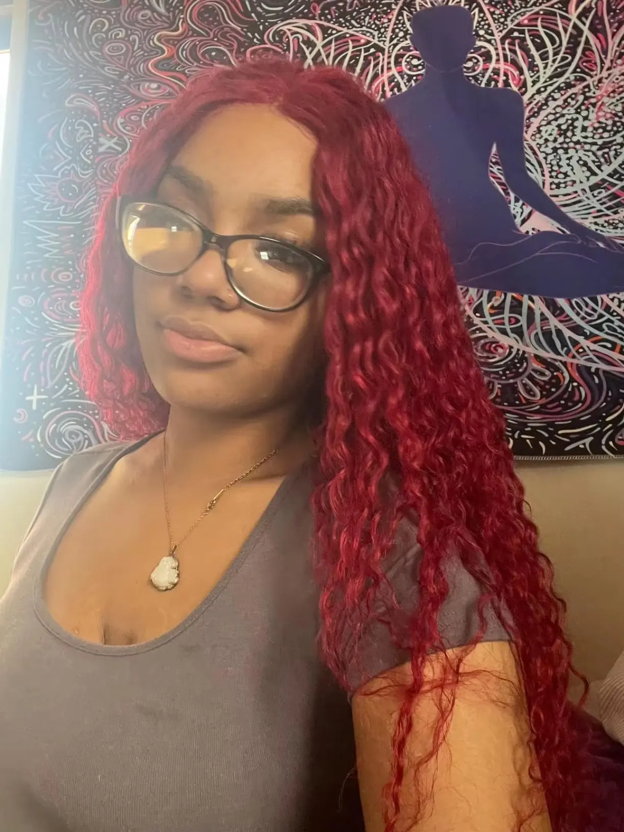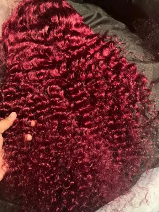 Close-up showing rich dark burgundy (99J) color of full lace deep wave wig under natural lighting.