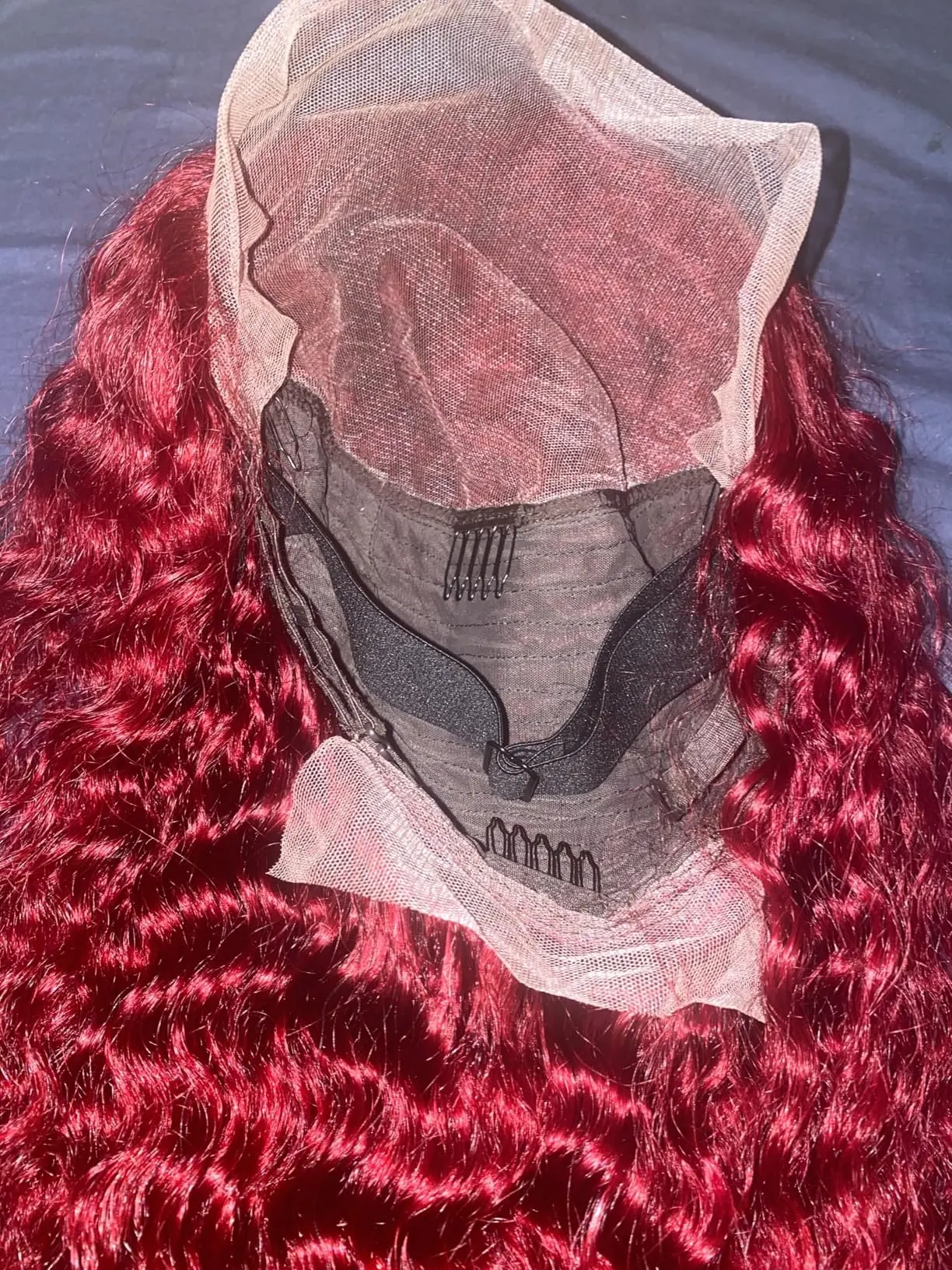 Interior cap construction of full lace wig in 99J burgundy deep wave, showing breathable lace and adjustable straps.