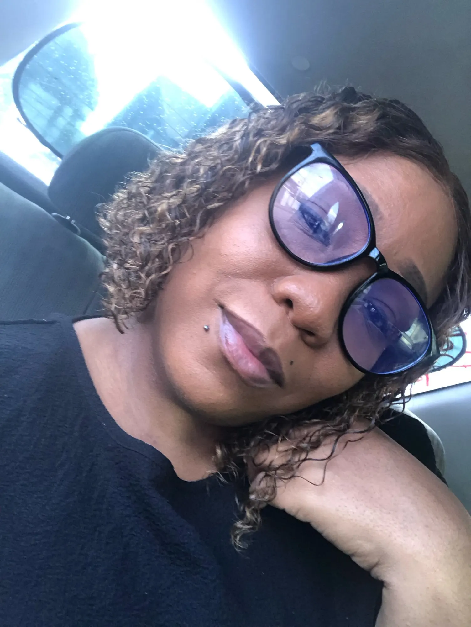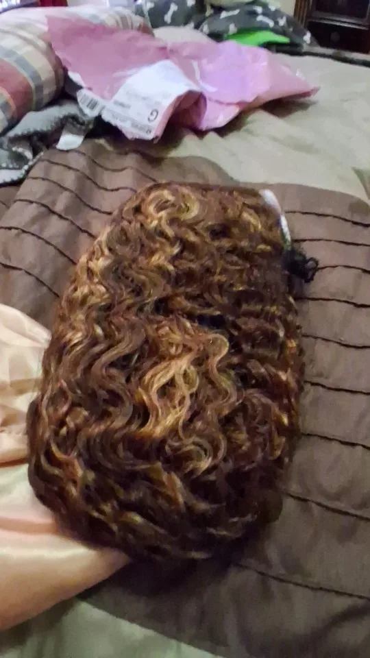 Side profile of short curly bob wig with honey blonde highlights and baby hair.
