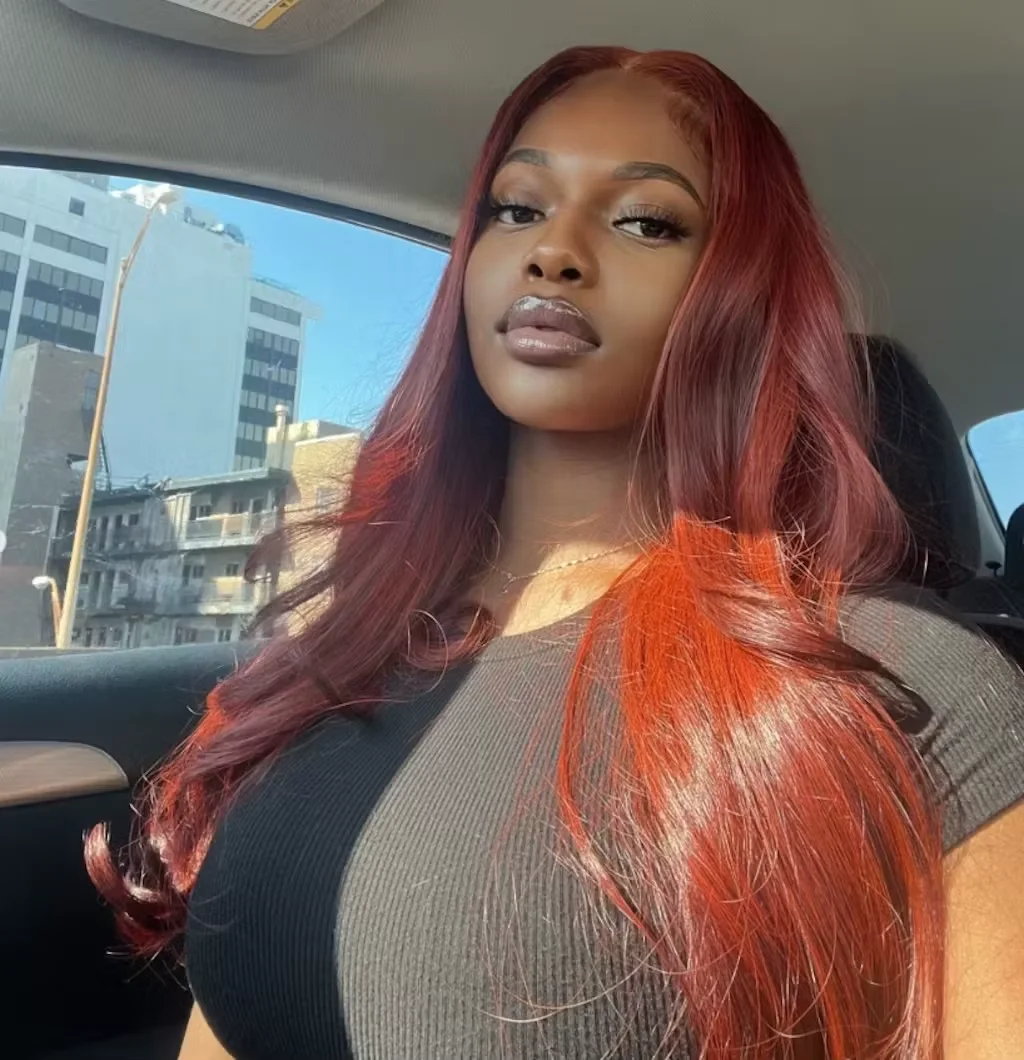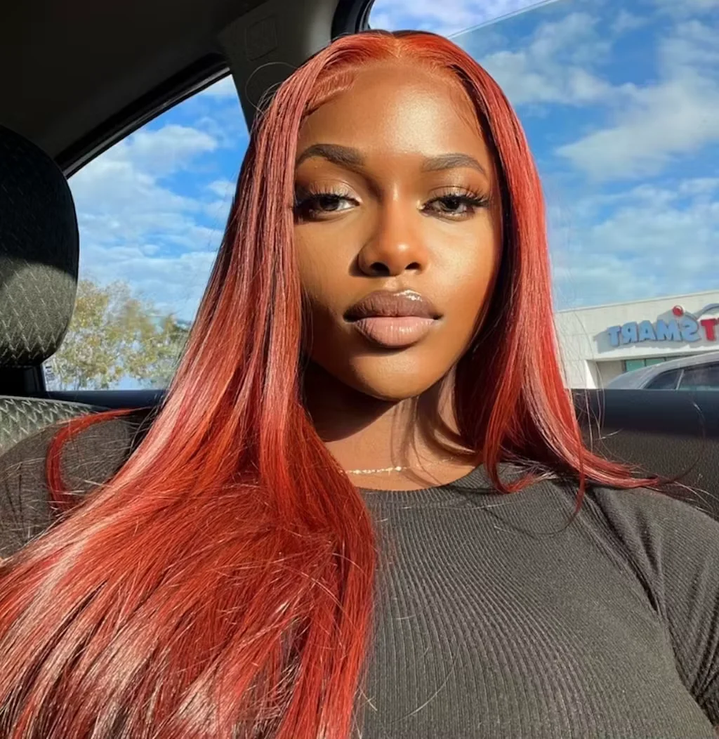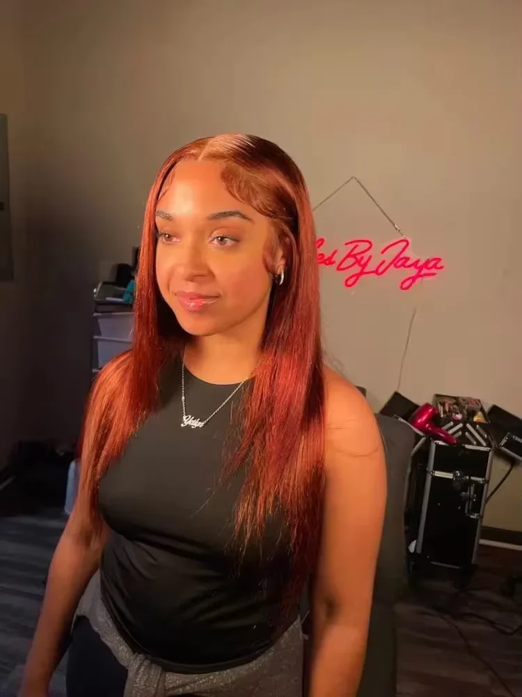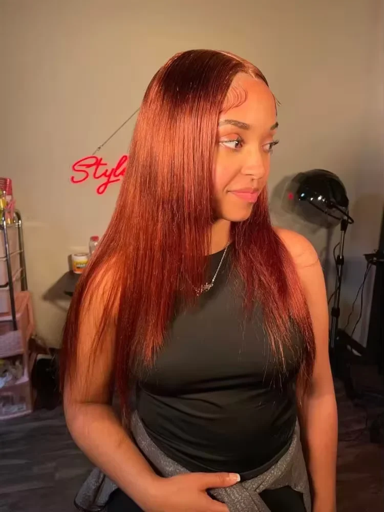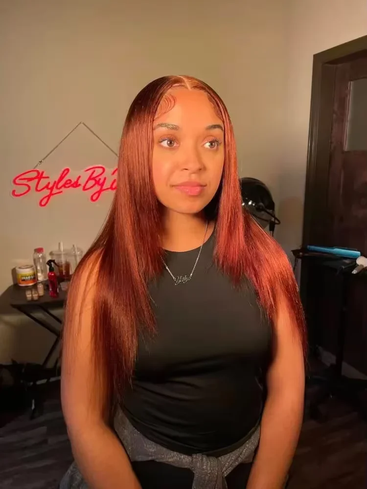 Woman wearing EuxmeHair reddish brown straight 4x4 lace wig with sleek middle part and natural baby hair.
