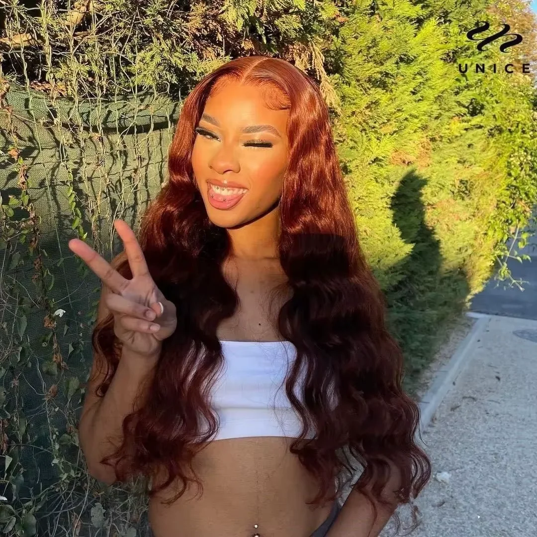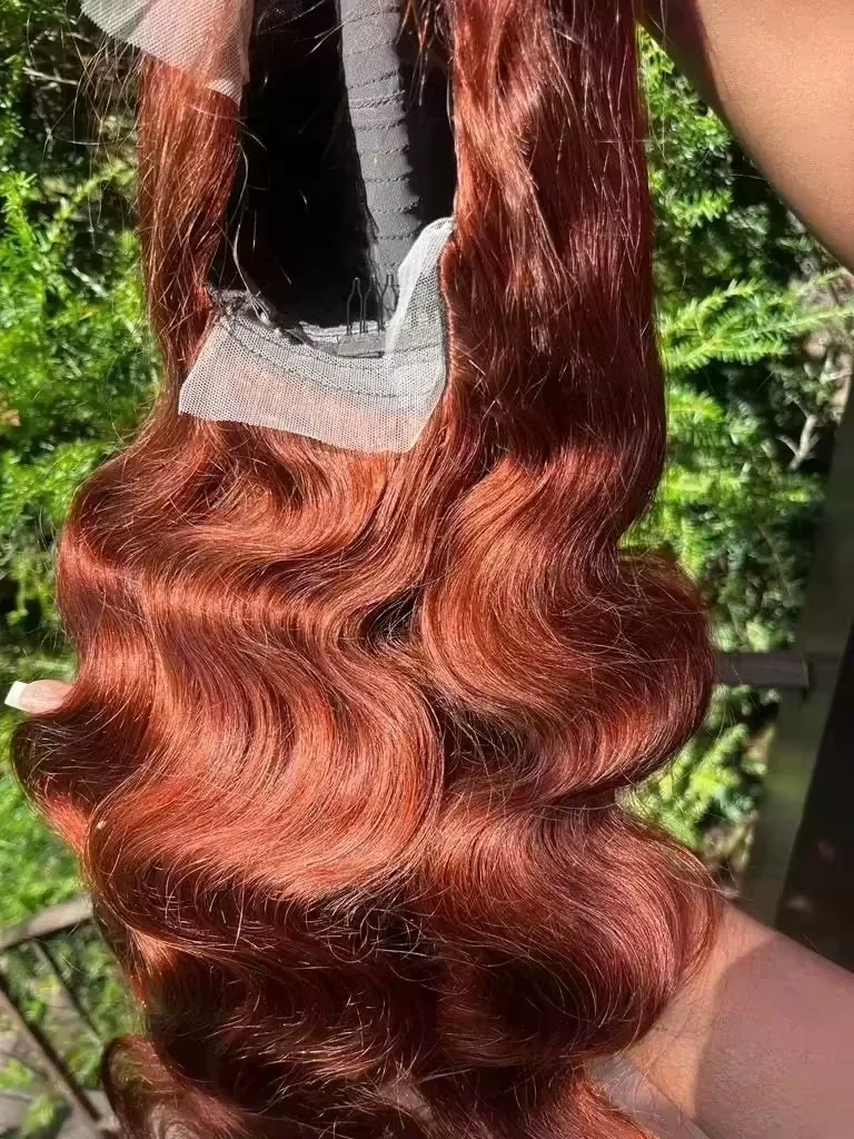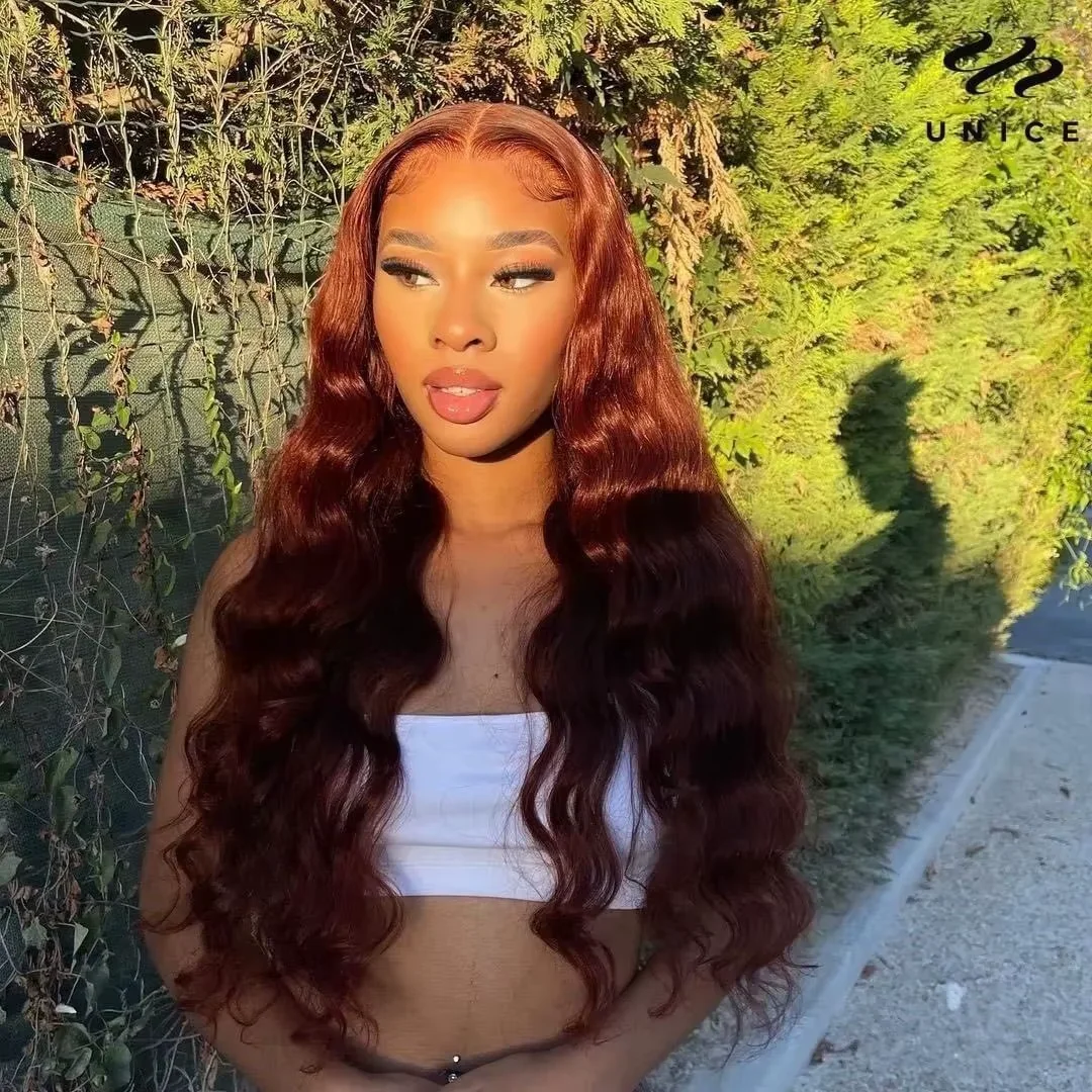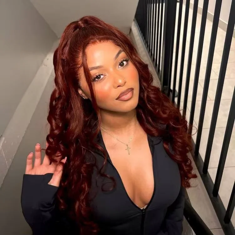 Woman wearing EuxmeHair reddish brown wig in natural light, showing long silky strands and defined middle part.
