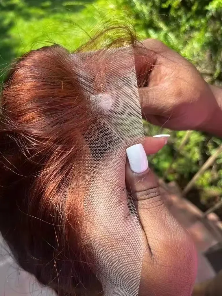Cap structure of 4x4 lace wig showing transparent lace, adjustable straps, and breathable elastic net for comfortable fit. Reddish brown wig displaying back view and close-ups of middle part, side part, and pre-plucked natural hairline. Mannequin head wearing straight reddish brown wig, shown with middle part, styled-up front, and front-on view to highlight lace realism. Transparent HD lace wig shown on hand and head with three models demonstrating natural look, length, and soft hairline effect. Features of upgraded 3D elastic wig cap including HD lace, anti-slip strip, adjustable belt, and large head friendly design. Reddish brown wig on mannequin stand showing close-up of smooth straight strands, natural lace, and hairline construction. Customer wearing straight reddish brown wig with side part, showcasing styled baby hairs, hairline, and glossy texture in salon lighting.