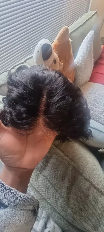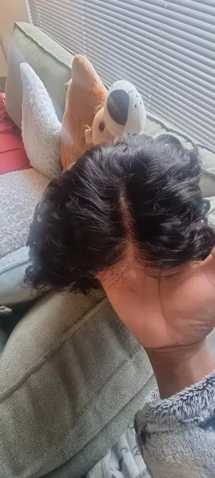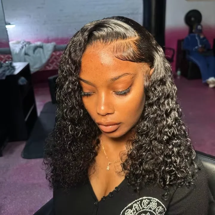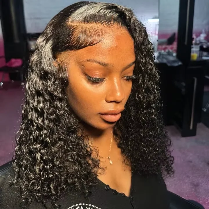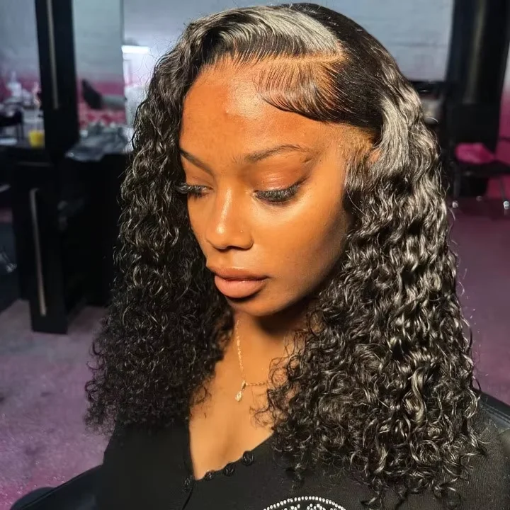 Close-up of 6x6 HD lace bob wig in Jerry Curl showing natural hairline and parting space.