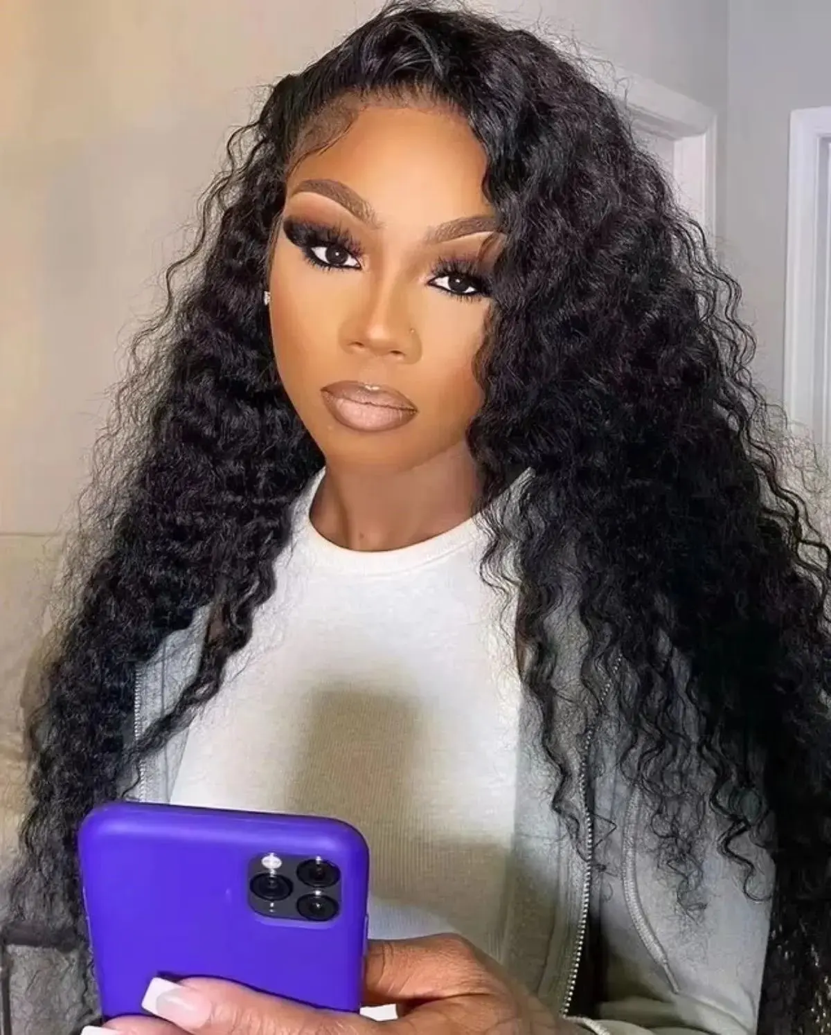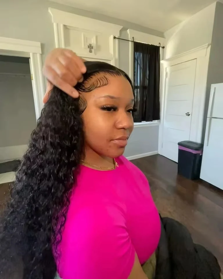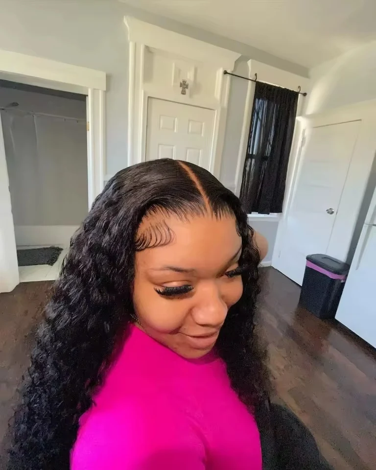 Deep wave wig worn with middle and side parting, shown on mannequin and model with sleek baby hairs and long volume.