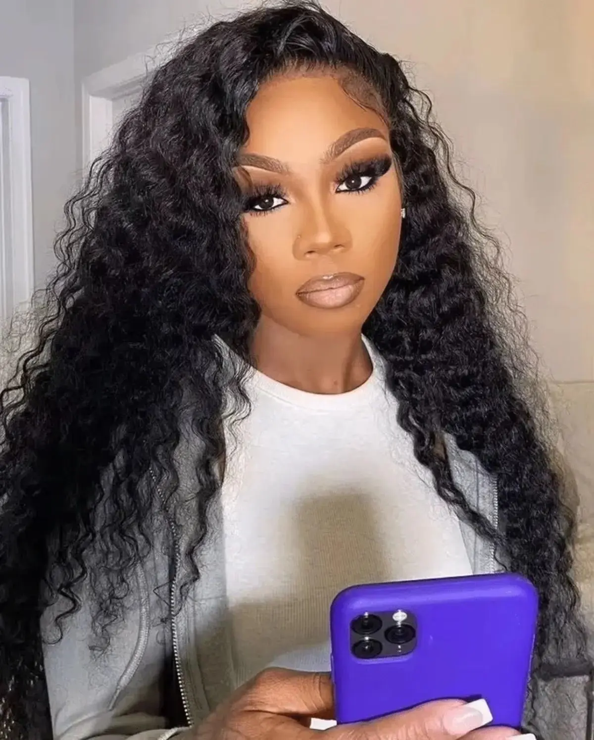 Model wearing long deep wave 5x5 glueless lace wig, showing front, side, and full back view of natural black curls.