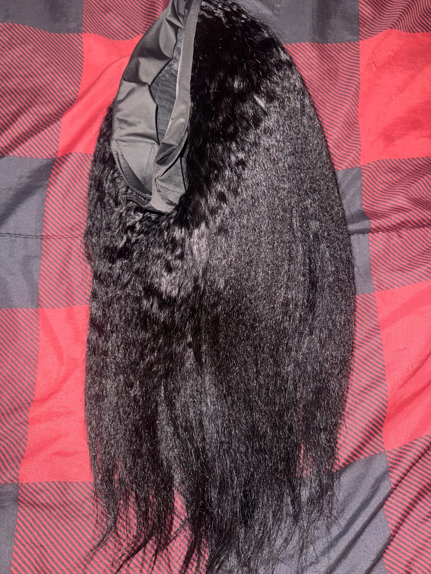 Kinky straight headband wig on mannequin with sleek texture and natural density visible from side angle.
