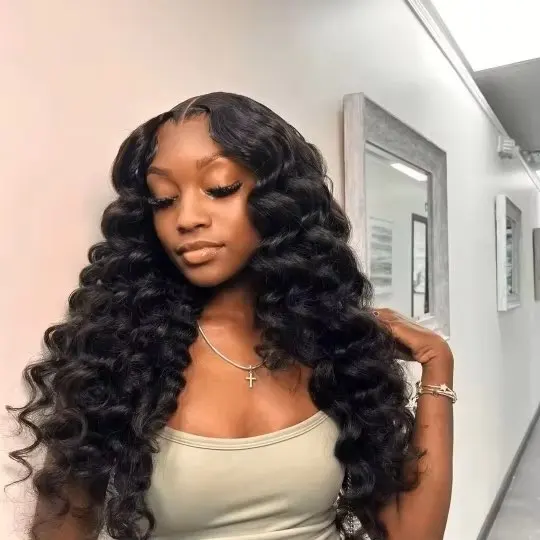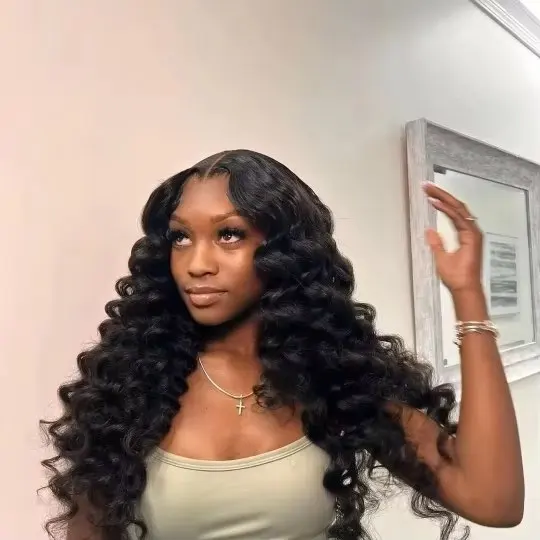 Loose Wave Wig comparison with model and mannequin, showcasing natural shine, defined curls, and natural hairline.