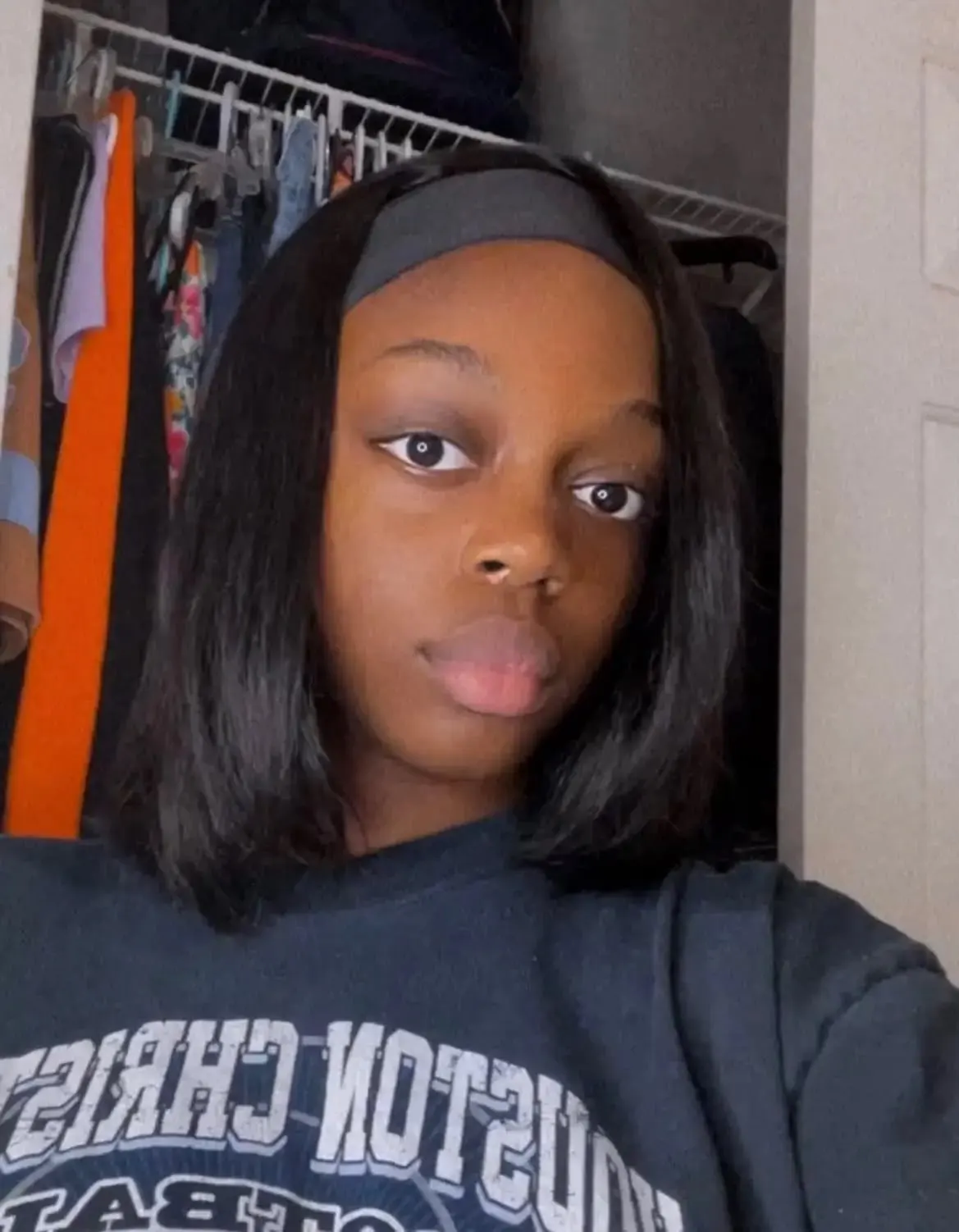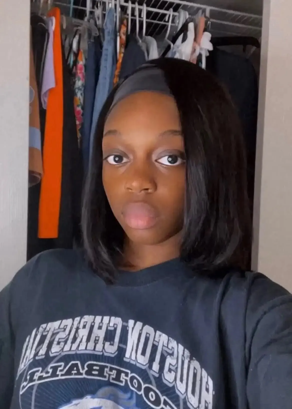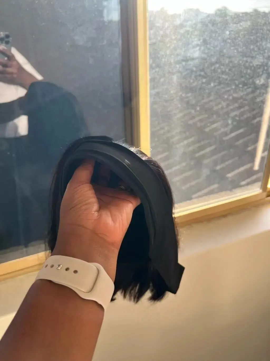 Before and after comparison of full look with bob headband wig, showing transformation and natural hairline coverage.